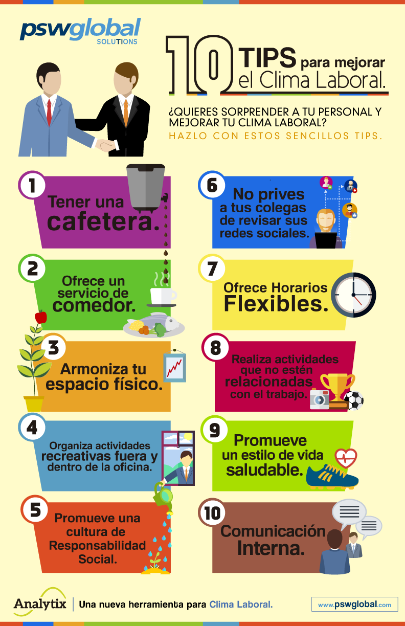 Una infografía con 10 consejos para mejorar el clima laboral. Vía